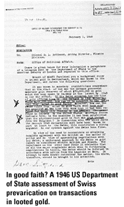 As a 1946 US government memorandum addressing the subject of "Allied Policies for Negotiations of Looted Gold Question" noted: "Allied negotiators should make it clear to the Swiss officials that the fact that specific looted gold is no longer in Swiss possession does not operate to defeat the Allied claim or hinder or impede the handing over of an equivalent amount of gold." This principle should certainly be applied today, especially now when some in Switzerland claim that the gold in question has already been passed on to other countries, "fenced" as it were, and therefore Switzerland is no longer obliged to pay any compensation.