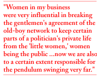 EG: Well, no. When I was a young journalist, I started writing just about the time that women's movement slogan came into effect, which did say the personal is political. And that meant a lot of things. It meant that who chooses the diapers at home has something to do with a meaningful power relationship between men and women. It meant that if we only talk about breast cancer and abortion as private issues, they would never be on the public agenda, but it also meant something about public life, and it meant something about covering our political leaders. It meant knowing something about the leader's personal life would tell something about where he or she was leading you. That is to say, who he was in private, who she was in private, said something about how he or she would be in public life. So, in effect, I think women in my business were very influential in breaking the gentlemen's agreement of the old-boy network in Washington that they would keep certain parts of a politician's private life from "the little women." The "little women" being the public. Now, we also were to a certain extent responsible for the pendulum swinging too far. And for the last several elections, certainly since Gary Hart committed character suicide in public there has been a great emphasis on private life, and we have been hard pressed to find the line between what is a "character investigation of a person's personal life" and what is gossip, what is invasion of privacy and what has some room for public life. Other times we've gone over to the gossip and to small stuff, to Clinton's underwear. It hasn't really helped us in thinking about how they would be as political leaders.