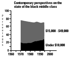 I believe a more accurate definition of the Black middle class places the income range between $25,000 and $49,999. I say this because the poverty line for a family of four, in 1995, was $15,569 ($15,141 in 1994). It seems disingenuous to categorize those making slightly more than the poverty line as members of the Black middle class. Using this income range puts the number of Black families in the middle class at 9 million or 31.9% of all Black families in 1994. (Keep in mind that 32.3% of all Black families earned incomes below the poverty line during the same period - 1994).