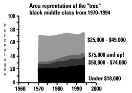 But using sheer numbers, the "true" Black middle class has NOT doubled. In 1970, the number of families earning between $15,000 and $49,999 reached 11,667,612. In 1990, the number grew to 13,309,033; hardly a doubling!