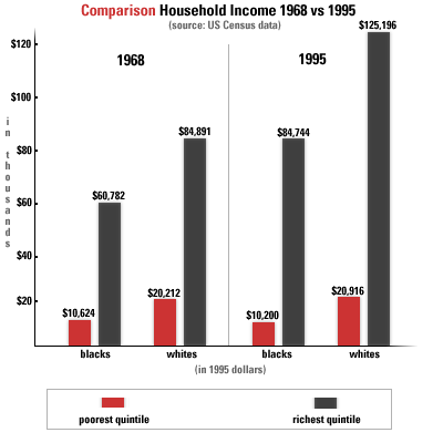 The above chart shows the growing spread between America's richest and poorest - and in both the black and white communities. In addition to showing that black household income still lags far behind white household income, it actually marks a decrease in the income of the poorest black households between 1968 and 1995 (in 1995 dollars).