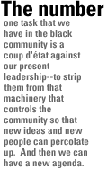That is why the number one task that we have in the black community is a coup d'état against our present leadership to strip them from that machinery that controls the community so that new ideas and new people can percolate up and then we can have a new agenda. But because of the way that it's controlled right now, the number one task of the black politician who's got these position should be to politically educate the black community but they didn't do that because they knew that if the black community was politically educated the first thing they would do would be to get rid of them.