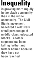 WILSON: See a lot of people back then felt that we would be free by '93 or '83 or '73 just by removing racial barriers. But the problem is that a system of racial discrimination over a long period of time can create racial inequality, a system of racial inequality that will linger on even after racial barriers come down. That is because the most disadvantaged blacks victimized by decades and centuries of racial oppression do not have resources that allow them to compete effectively with other people. They are at a disadvantage.