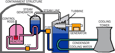 When control rods are lifted from the fuel assembly, neutrons (from the natural decay of uranium) bounce around and bombard other uranium atoms, causing them to split. This process gives off more neutrons and causes more splitting. This is a chain reaction. The heat generated from all this fissioning is converted into steam, which turns a turbine, which turns a generator that produces electricity.