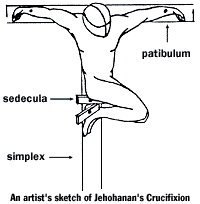 Christian art has continuously portrayed Jesus as attached to the cross with his extremities fully extended. Jehohanan's torso was forced into a twisted position with his calves and thighs bent and unnaturally twisted. Since the bent nail did not secure the legs to the cross, a plank (sedecula) was probably fastened to the simplex, providing sufficient support for the buttocks and prolonging torture. If Jesus had been crucified in a similar fashion, and we cannot be certain of this although it is probable, his contorted muscles probably would have generated spasmodic contractions (tetanizations) and rigid cramps would eventually permeate the diaphragm and lungs so as to prohibit inhalation and exhalation. Jesus could have died after six hours.