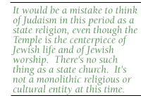 It would be a mistake to think of Judaism in this period as a state religion, even though the temple is the centerpiece of Jewish life and of Jewish worship. There's no such thing as a state church. It's not a monolithic religious or cultural entity at this time. Indeed, what we're seeing more and more through the research and the archaeological discoveries, is how diverse Judaism was in this period. So we see different groups, such as the Sadducees and the Pharisees. We also see a number of new religious texts and new practices starting to develop. .... For example, let's not forget that the Holy Day, the festival of Hanukkah, was a relatively new holiday celebration at the time of Jesus. It had only been around for something like a hundred years. But it shows some of the new ideas, the new experiences that Jews have had to overcome in that time. And so, we're watching a religious tradition that is itself still going through certain changes. Some of those changes were met with a view of optimism and progress. Some people, though, might not have liked them. And so, this sets the stage for what we see as some of the tension and some of the controversy that also surrounds the temple. So the interesting thing about the temple in the days of Jesus is that on the one hand, it's a grand, new place. It's the center of life and worship. It's the showpiece of Jewish tradition. And yet, it could also be a center of controversy and tension.