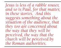 Luke's audience seems to be predominantly gentile.... when they talk about the story of Jesus there's more of an emphasis on the political situation of Jesus today. Jesus is less of a rabble rouser, and so is Paul, for that matter, in these stories. And this suggests something about the situation of the audience, that they too are concerned about the way that they will be perceived, the way that the church will be perceived by the Roman authorities. It's sometimes suggested that Luke's gospel should be seen as a kind of an apologetic for the beginnings of the Christian movement, trying to make its place in the Roman world, to say, "we're okay, don't worry about us, we are just like the rest of you: we keep the peace, we're law abiding citizens, we have high moral values, we're good Romans too." ...