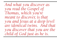 Now, [in the Gospel of Thomas], this Jesus comes to reveal that you and he are, if you like, twins.... And what you discover as you read the Gospel of Thomas, which you're meant to discover, is that you and Jesus at a deep level are identical twins. And that you discover that you are the child of God just as he is. And so that at the end of the gospel Jesus speaks to Thomas and says, "Whoever drinks from my mouth will become as I am, and I will become that person, and the mysteries will be revealed to him." Here, Jesus does not take the role of authority and teacher. In the Gospel of Thomas, the disciples say to Jesus, "Tell us, what do you want us to do? How shall we pray? What shall we eat? How shall we fast?" Now if you look at Matthew and Luke, Jesus answers the questions. He says, "When you pray, say, 'Our Father who are in Heaven, hallowed be...' When you fast, wash your face, don't make a show of it. When you give alms do it privately and without being showy." In this gospel, this Jesus does not answer. He says, "Do not tell lies, and do not do what you hate, for everything is known before heaven." Now this answer throws you and me upon ourselves.... Here Jesus, in effect, turns one toward oneself, and that is really one of the themes of the Gospel of Thomas, that you must go in a sort of a spiritual quest of your own to discover who you are, and to discover really that you are the child of God just like Jesus.