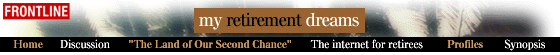 home   Join our discussion on retirement .  "A Look at the Land of our Second Chance" .  The internet for retirees .  Profiles