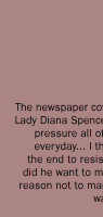 a:  Yes. I think that the coverage which newspapers gave to his friendship let's say at that stage with Lady Diana Spencer became so feverish that it created a pressure all of its own. We had stories everyday. We had pictures everyday about her. News, newspapers were vying for the latest photograph and it did become a rolling bandwagon that I think Charles found impossible in the end to resist. It wasn't so much a question of did he want to marry her as did he have a good reason not to marry her, when it came to a confrontation with the Queen and with his father, they said Well what's wrong with this girl? What's wrong with this girl? She's perfect. And to a certain extent it was a marriage made by the media. She was created if you like as a bride for Charles.