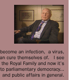 This leads me to think that we would not improve our affairs were we to switch from royal to republican. I do think that at the bottom of both these, as it were at the bottom of both the Washington and the London well there lurks excessive zeal on behalf of the modern med. And I go back to the point when I am not certain that a modern democracy can put up for long with the extent of intrusion which goes on not only in their lives but in public life as well.