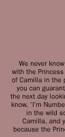 a:  Yes, well we never know when we're going to get a picture with the Princess because if there was a good shot of Camilla in the paper looking good and sexy, then you can guarantee that the Princess would be out the next day looking even sexier, sort of saying, you know, 'I'm Number One.' So it used to be like a call in the wild sort of thing. You know you'd see a picture of Camilla, and you know where to go the next day because the Princess would be giving out pictures.