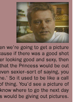 a:  Well this was quite early on actually before the Andrew Morton book. What happened was he goes up for a regular visit to Scotland for fishing during the Easter breakwith Prince Harry and William and the normal paparazzi arriving in the local town there, Balmoral, and just as we're sort of settling in, one of the policemen came round to the hotel and sort of put his cards on the table and said 'What would you like?' And we said 'Well what do you mean-- what would you like?' He said 'What pictures do you want?' So we said 'Well this is very strange but we'll have Prince Charles with the two Princes on the riverbank just throwing stones in the water. That would be nice.' And he said 'Right okay. I'll see what I can do. Eleven o'clock tomorrow morning be here at this position.' And so we went there and there, there they were throwing the stones in the water. They gave us ten minutes of lovely pictures and that was just an occasion when, you know, they do use the paparazzi and the media to get across a point and I've always wondered where the, because the deal was that we got the pictures and then we left them alone for the rest of the weekend so that they could have a quiet weekend but I do have a suspicion that there was a bigger fish to fry up there with maybe he had Camilla up there at the time and he just wanted us out the way so he could enjoy his weekend with Camilla.