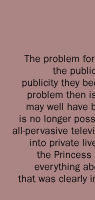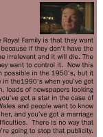 a:  The problem for the Royal Family is that they want the publicity because if they don't have the publicity they become irrelevant and it will die. The problem then is that they want to control it. Now this may well have been possible in the 1950's but it is no longer possible in the1990's when you've got all pervasive television, you've got loads of newspapers looking into private lives, you've got a star in the case of the Princess of Wales and people want to know everything about her, and you've got a marriage that was clearly in difficulties. Now there is no way that you're going to stop that publicity and it's a nonsense to believe that somehow you can have the fairy tale without the big, bad giants I'm afraid.