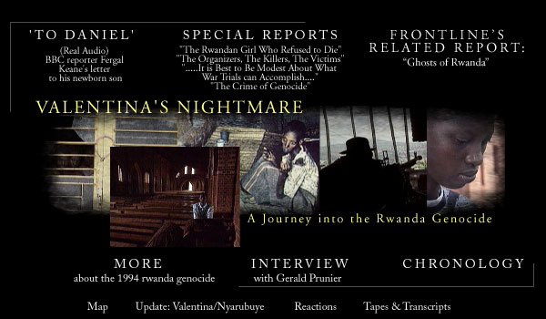 Four days after the slaughter of her village, Valentina, a thirteen-year-old Tutsi girl, lay hidden among the corpses of her family and neighbors, her machete wounds festering with infection. Miraculously, she would survive to tell her story. FRONTLINE looks back at the origins and the horrors of the 1994 massacre of 800,000 Tutsis by the Hutu majority in Rwanda and examines the country's struggle for justice and reconciliation in the aftermath of the bloody genocide.