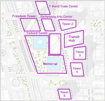 Here is a look at the various buildings that are being planned for the former World Trade Center site as of September 2004.