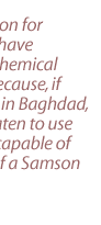 It's protection for Saddam to have biological/chemical weapons, because, if surrounded in Baghdad, he will threaten to use them.  He's capable of that ...sort of a Samson complex--if you push me too hard, I'll bring the house down, on myself and everyone. So he had the guarantee that he would succeed in his efforts. His removal of Bakr needed a guarantee that no one would act against him. He removed Bakr rather unceremoniously and made himself president. And he reshaped the Ba'ath Party in no time at all by executing half of the command of the party. And then he went to war with Iran, thinking it is going to last a few weeks. Iran will see that the West is helping me, and they will not fight for long.