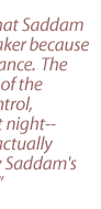 Of course, we think that Saddam is much weaker because of our resistance. The south is out of the regime's control, especially at night, which was actually admitted by Saddam's son-in-law when he defected to Jordan. Saddam's government instructed Ba'ath Party members, officials, and military units not to be out after five o'clock in the evening, because of the danger from the resistance. It's a clear indication that we are able to control the south of Iraq completely.