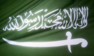 The flag of Saudi Arabia. The Arabic text translation is: "There is no god but God; Muhammad is the Messenger of God"