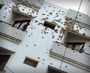 Bullet holes riddle the wall of the apartment building in Karachi where Ramzi bin al-Shibh was arrested. (Photo by Marcela Gaviria)