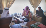 After a cursory security inspection, we pass the front gate and pull up to the entrance. Car doors open and shut. We are guided through more security. Inside a line of men stands to my right and I am moved over to shake hands with an official whose name, rank or importance I completely miss. We are moved upstairs. Here in the second floor lobby some men move about looking purposeful; others are fidgeting, talking and pacing. There is a lot of adjusting of headpieces and robes. We are ushered into a large hall and asked to walk forward. On either side of the room are five rows of chairs facing inward which are by now full of all sorts of men -- from rough looking tribesmen with gnarled hands holdings canes and staffs to princely types with soft hands bejeweled with diamonds and gold. Ahead of me, opposite the main door is a raised desk and chair against a large picture window looking out over Riyadh. A microphone sits on the desk. I am seated near the front. I am introduced to a man on my right. He is a son of Crown Prince Abdullah's and current chief of the National Guard, a position, of course, that he inherited from his father.