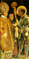 Here, no doubt, is a major reason why St. Maurice would become the champion of the old Roman church and an opposition symbol to the growing influence of Luther and Calvin. The fact that he was of the same race as the Ethiopian baptized by St. Philip in Acts of the Apostles was undoubtedly an important element to his significance as well. Since this figure from the New Testament was read as a personification of the Gentile world in its entirety, the complexion of St. Maurice and his Theban Legion (the number of which signified an infinite contingent) was also understood as a representation of the Church's universality - a dogmatic ideal no longer tolerated by the Reformation's nationalism. Furthermore, it cannot be coincidental that the most powerful of the German princes to remain within the Catholic fold, the archbishop Albrecht von Brandenburg, not only dedicated practically all the major institutions under his jurisdiction to St. Maurice but in what is today one of the most important paintings of the Renaissance, had himself portrayed in Sacred Conversation with him. Even more blatant was the action taken by Emanual Philibert, Duke of Savoy. In 1572 he organized the order of St. Maurice. The papal promulgation published at its institution declared quite unequivocally that the sole purpose for this knighthood was to combat of the Reformation. The order still exist exists although it has now combined with the Order of St. Lazarus. The white trefoiled cross of the combined order belongs to the former.