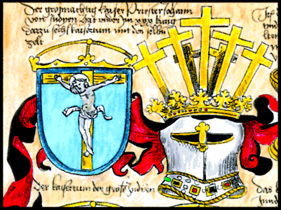 In addition to St. Maurice, there is also another figure connected to the blackamoor coat of arms. It is the semi-mythical Negus (emperor) of Ethiopia, Prester John. To Otto von Freising an Imperial Hohenstauffen Prince Bishop of the 12th century who was tired and torn by the endless struggle between Church and State, this black man who was both priest and king and ruled a land of peace and plenty at the edge of the world became the personification of the ideal state. To this day the arms of the see of Freising is the bust of a crowned blackamoor.