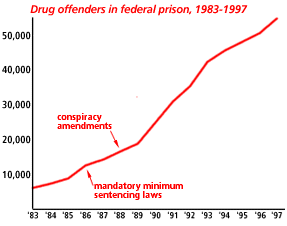 In 1988 Congress passed another, pre-election Anti-Drug Law. One of the provisions was urged by the Department of Justice to simply close a little loophole. The change was to apply the mandatory sentences of 1986, intended for high level traffickers, to anyone who was a member of a drug trafficking conspiracy. The effect of this amendment was to make everyone in a conspiracy liable for every act of the conspiracy. If a defendant is simply the doorman at a crack house, he is liable for all the crack ever sold from that crack house -- indeed, he is liable for all of the crack ever sold by the organization that runs the crack house. After the conspiracy amendment was enacted the prison population swelled. Within 6 years, the number of drug cases in federal prisons increased by 300%. From 1986 to 1998 it was up by 450%.