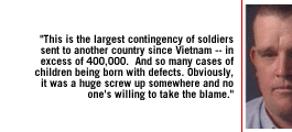 A1: Because -- we're talking about soldiers -- such a large contingency of soldiers. This is the largest contingency of soldiers that have been sent to another country since Vietnam -- in excess of 400,000 soldiers in one place and so many cases of children being born with defects. Husbands and wives that were in the Gulf that are suffering from various symptoms. I mean we're talking about something on a large scale and that's what I mean by nobody's willing to take a blame for something that -- obviously, it was a huge screw up somewhere and no one's willing to take the blame.