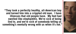I feel like a walking medical experiment in a sense... I know my past, I know my health, and my physical being. They took what I considered a perfectly healthy, all American boy and turned him into a crippled old man. I have illnesses that old people have, I have aches and pains and cramps and headaches and I've never experienced that kind of physical pain before, that kind mental anguish before that I have now.