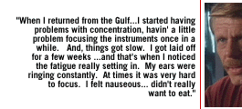 A. When I returned from the Gulf I went back to my civilian job. I worked as a crew chief for a land surveying and engineering firm....I started having problems with concentration, havin' a little problem focusing the instruments once in a while. By -- a lot of it I thought was just well I'd been away from it for 10 months now and, kind of pick it up. And, things got slow. I got laid off for a few weeks and I was doing side jobs, and that's when I noticed the fatigue really setting in. I noticed my ears were ringing constantly. At times it was very hard to focus. I felt nauseous. I didn't really want to eat, and it was about some time in November I believe, I ran across, I was going out for a weekend drill. I ran into a soldier from the battalion who said I looked terrible. Thank you very much. I really appreciate that you know.