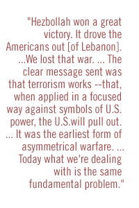 But if Hezbollah was the victor in that war, so was Iran and so was Syria. ... What was the message sent by our pulling out and allowing Hezbollah, Syria, and Iran to win that battle?