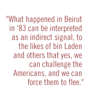 Now, of course, what you have here is a direct admission that the United States really was not fighting to protect its basic strategic interests in Lebanon, because there were no such interests in Lebanon. You cannot drive the United States easily from the Gulf War, from Kuwait, or from Saudi Arabia. But, you can drive the United States out of Lebanon, out of Somalia. Because the American public will not support a military adventure in those countries when there is no clear-cut American interest to protect. ... What happened in Beirut in '83 can be interpreted as a signal, albeit an indirect signal, to the likes of Osama bin Laden and others that yes, we can challenge the Americans, and we can force them to flee.