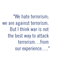 We hate terrorism; we are against terrorism. But I think the war is not the best way to attack the terrorism and make success against them. From our experience, I can say that the violence against terrorism is not the way to get success against them. The best way is to know what they want, why they are against us, why they do that crime. If we know that and if we explain to them all the wrong thoughts in their minds, I think this is the best way. ...