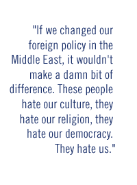 Yes. With all due respect, I think if we changed our foreign policy in many ways in the Middle East, it wouldn't make a damn bit of difference. These people hate our culture, they hate our religion, they hate our democracy. They hate us.