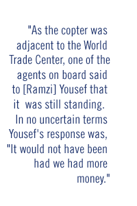 Our responsibility at the time was to transport Ramzi Yousef into the metropolitan correctional center in lower Manhattan. In order to do that, we did use a helicopter to transport him down the Hudson River. It was on a very clear night. For a point in time, he was blindfolded. And we allowed him to remove the blindfold. Ironically, he focused his eyes, as the helicopter was adjacent to the World Trade Center, one of the agents that was onboard the helicopter said to Mr. Yousef that the World Trade Center was still standing. And in no uncertain terms, Yousef's response was, "It would not have been, had we had more money."
