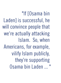 If [Osama bin Laden] is successful, he will convince people that we're actually attacking Islam. So, when Americans, for example, vilify Islam publicly or when they attack Arab-Americans, they're supporting Osama bin Laden. ...