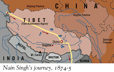 .....The last words on Nain Singh are best left to Colonel Yule, addressing the Royal Geographic Society at the time of its presentation of the Society's gold medal. Nain Singh, he said, "is not a topographical automaton, or merely one of a great multitude of native employees with an average qualification. His observations have added a larger amount of important knowlege to the map of Asia then those of any other living man."