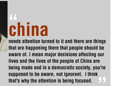 a:  China needs attention turned to it and there are things that are happening there that people should be aware of. I mean major decisions affecting our lives and the lives of the people of China are being made and in a democratic society, you're supposed to be aware, not ignorant. I think that's why the attention is being focused.