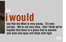 a:  Release. Light. Happiness. I would say that the West is very young, it's very corrupt. We're not very wise. And I think we're hopeful that there is a place that is ancient and wise and open and filled with light.