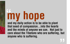 a:  Well, obviously my hope is that along with leading these people into contemplation and giving them a lot of insight as to what's really happening, that people can stand up and try to change their lives to make a difference. That is to say, that they may have to, in fact, put themselves at great sacrifice -- make life more difficult for them . Put others before them, to make these changes. And there is a way to move people to that degree. And. . my hope and my daily action is to be able to plant that seed of compassion, of what we call (inaudible), into the hearts and the minds of . . . of anyone we can. Not just to care about the Tibetans who are suffering, but anyone who is suffering.
