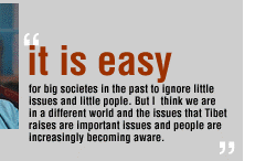 a:  I hope that little Tibet will be a very important element in the developing agenda. It is easy for big governments or big societies now and definitely in the past in history to ignore little issues and little people, little things. But I think we are in a different world and the issues that Tibet raises are important issues and people are increasingly becoming aware of that such as environment and human rights. They are not just something that's in the way that needs to be removed because there's such a pesky issue. They are actually touching on fundamental issues about how the United States should be in its contact of foreign policy and domestic policy and how China should be in its internal development.