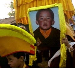 Protesters carry a picture of the exiled Panchen Lama,Gendun Choekyi Nyima, who was chosen by the Dalai Lama.