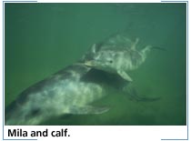 That left us with just Mila and her new born calf to worry about. They were regularly sighted 25 to 35 km south of Two Rocks after the group disintegrated and it became obvious that both were losing weight. The decision was made to feed Mila from our boat, but after four weeks at sea her calf went missing and can be presumed dead. At about the same time Mila's radio tag failed, making it very difficult for us to find her. However, she began approaching and following fishing boats, presumably begging for fish, and we were able to track her down with the help of local fishermen. When we found Mila again her condition had improved slightly, but she was still underweight and her choice of foraging methods -- following boats and accepting fish handouts -- was considered inappropriate, potentially dangerous, and evidence that she was not integrating properly into the wild. Mila was never seen interacting with wild dolphins, although on several occasions groups were nearby. We decided to recapture her and return her to the sea pen with Rajah and Echo. This was accomplished on 28 February. After 44 days at sea Mila showed a weight loss of 23 kg (15% of her pre release weight) despite receiving substantial fish handouts during the last two weeks.