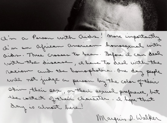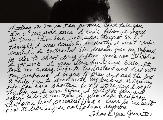 The photographs of Juanita and Marquis are from the book Epitaphs for the Living: Words and Images in the Time of AIDS by Billy Howard (Southern Methodist University Press, 1989). In Febuary 1987, Howard began taking pictures of what were then known as Persons With AIDS (PWAs), and he invited each individual he photographed to write an accompanying statement.