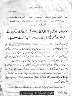 The Taliban posts these threatening notes, known as "night letters," on mosques, schools and government buildings at night, under the cover of darkness. Signed by "Militants of the Islamic Republic of Afghanistan" and purportedly a statement from Osama bin Laden, this letter, which circulated in May 2006, promises revenge on the Pakistani army for operations that killed citizens and destroyed property in Waziristan and calls for the assassination of Pakistani President Pervez Musharraf.