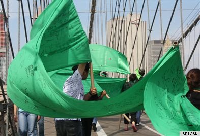 On Thursday morning, a mile-long green banner was marched over New York's Brooklyn Bridge by green-clad opposition supporters.