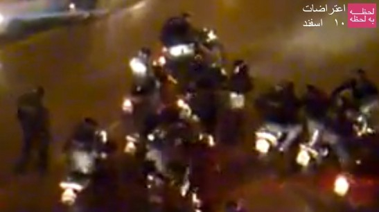 Plainclothes agents and police officers mount their motorcycles to disperse the crowd. As they do, more voices join in. Many of the regular police do not appear enthusiastic about beating the people and do little more than provide cover for the plainclothes forces who stage the attack. Their lukewarm attitude does not endear them to the plainclothes agents. Some arrests are made -- based on many reports, people often resist being detained. An eyewitness account on Gooya News described how the crowd on Kargar Shomali fought back to release a young man arrested by Basij militia.