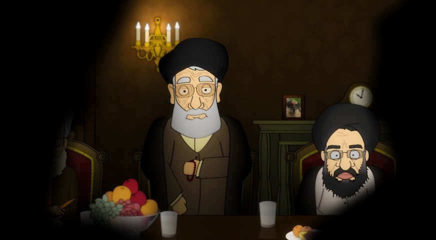 The duo apparently behind the sketches and parodies identify themselves as Bahram Kour and Jhadagar Ali. And they are equal opportunity offenders. No one is spared. (So click through with caution: there is cartoon violence and some distasteful scenes as well.) Among the more tame, The God Fathers features the usual suspects. Mir Hossein Mousavi is not a favorite either, and he's unfavorably depicted as he issues his latest statement or takes part in a presidential debate in "the first free election in Iran." The Green Movement is further ridiculed in a parody of exiled film director Mohsen Makhmalbaf on a talk show. Iranian Americans, L.A. pop stars, talebs, and intel agents alike are the target of infomercials and movie trailers. And there's a grab bag for the monarchists, too: Reza Pahlavi has his own solution to the rift between Supreme Leader Ali Khamenei and Mahmoud Ahmadinejad. And how about a history lesson from his father, the late Shah?