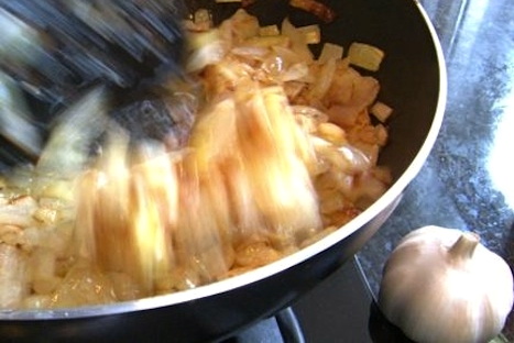 3. When the onions are soft and a tiny bit brown at the edges, she adds the paste of garlic and turmeric, stirs once or twice, and then turns off the heat. "You don't want this to get too cooked yet."
